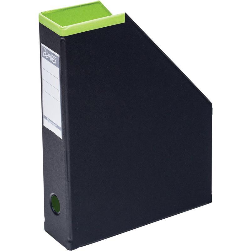 Вертикальный накопиль Bantex служит для хранения печатных документов и каталогов формата А4. На корешке имеются сменная этикетка для поиска и удобное кольцо для быстрого снятия с полки. Изготовлен из жесткого картона, обтянут ПВХ. Складной, легко собирается. Высота передней стенки — 150 мм, ширина — 70 мм. Толщина картона — 1.75 мм, толщина пленки ПВХ — 0.15 мм. Размеры изделия (ДxШxВ) — 240x70x310 мм.