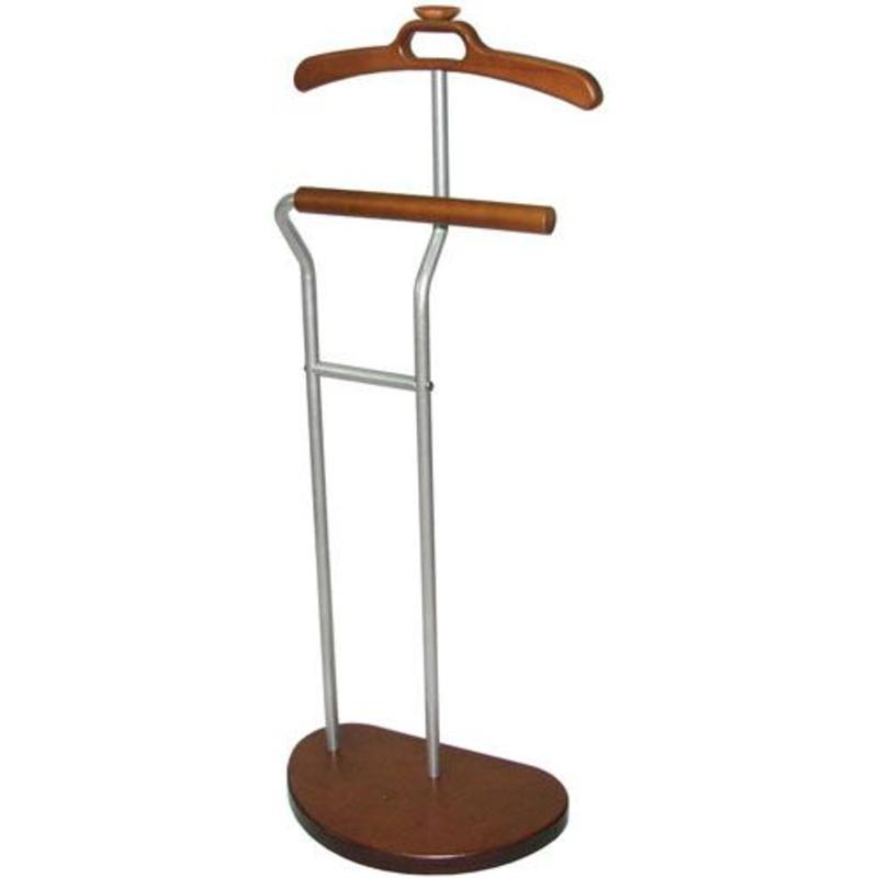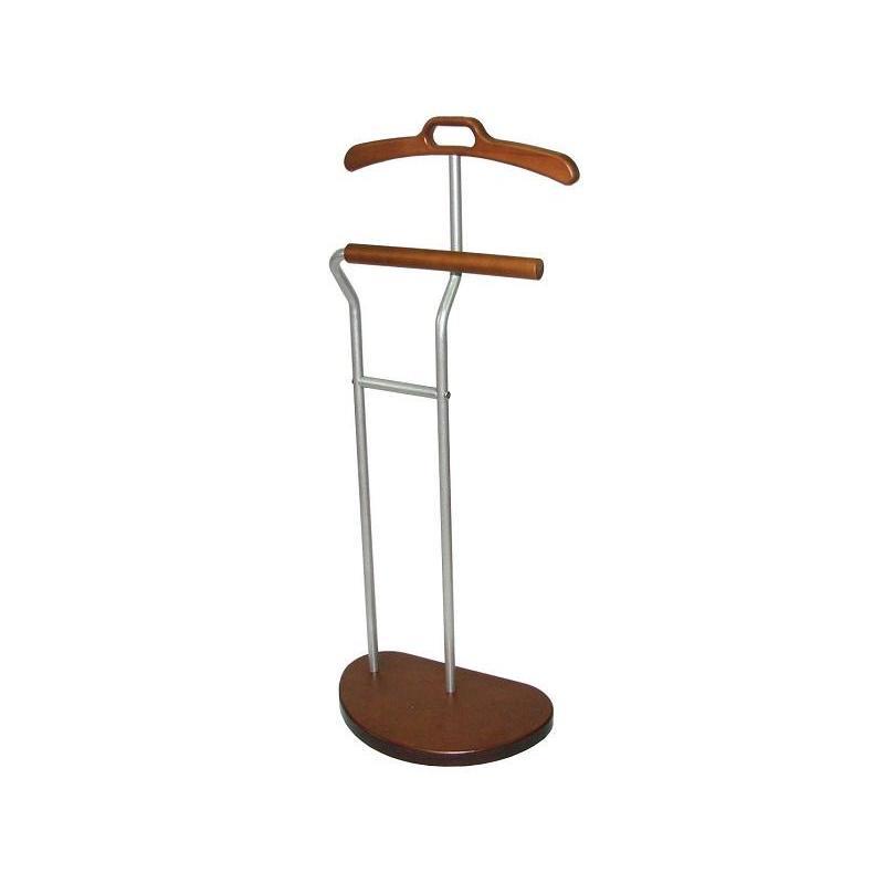 Костюмная вешалка D10 на устойчивой платформе, изготовленная из алюминия и натуральной древесины цвета «орех» с лакированным покрытием. Модель снабжена анатомическими плечиками, миниатюрной полкой для аксессуаров и перекладиной для подвешивания брюк и галстуков. Размеры вешалки — 440x280x1100 мм.