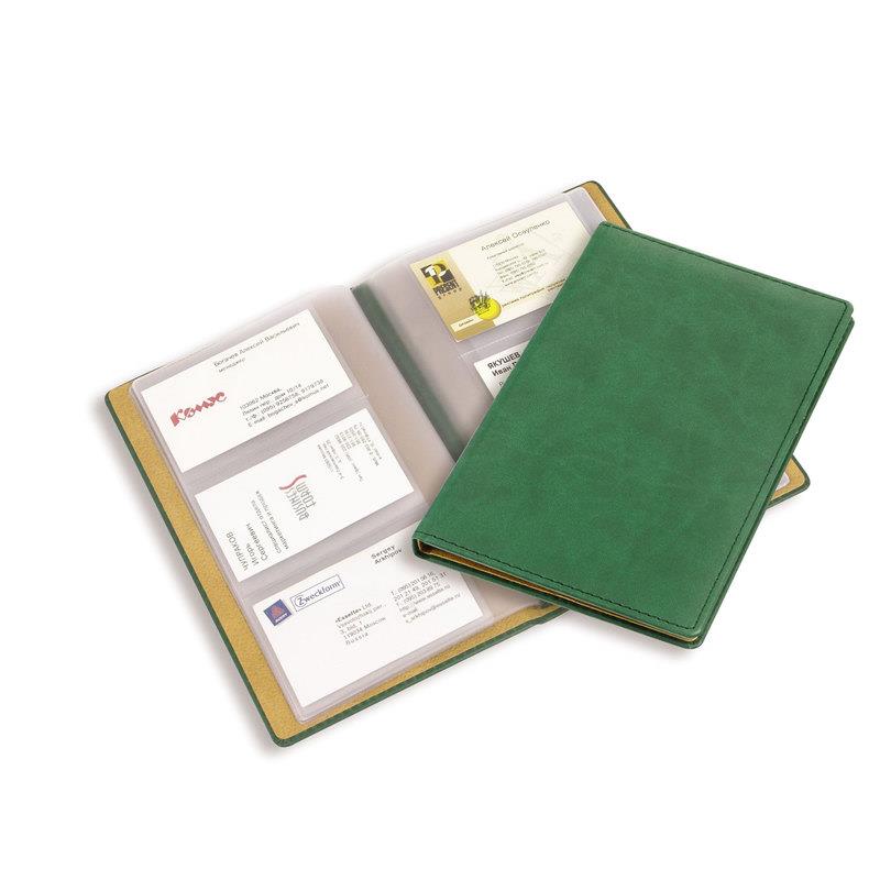 Вертикальная настольная визитница Attache из коллекции «Вива» имеет твердую обложку зеленого цвета, изготовленную из искусственной кожи с защитным лакированным покрытием. Размер — 133x202 мм. Карманы из прозрачного полипропилена вмещают 72 визитные карточки или банковские карты стандартного размера. Материал обложки подходит для нанесения логотипа любым способом тиснения. Каждое отделение предполагает возможность хранения2-х визиток.