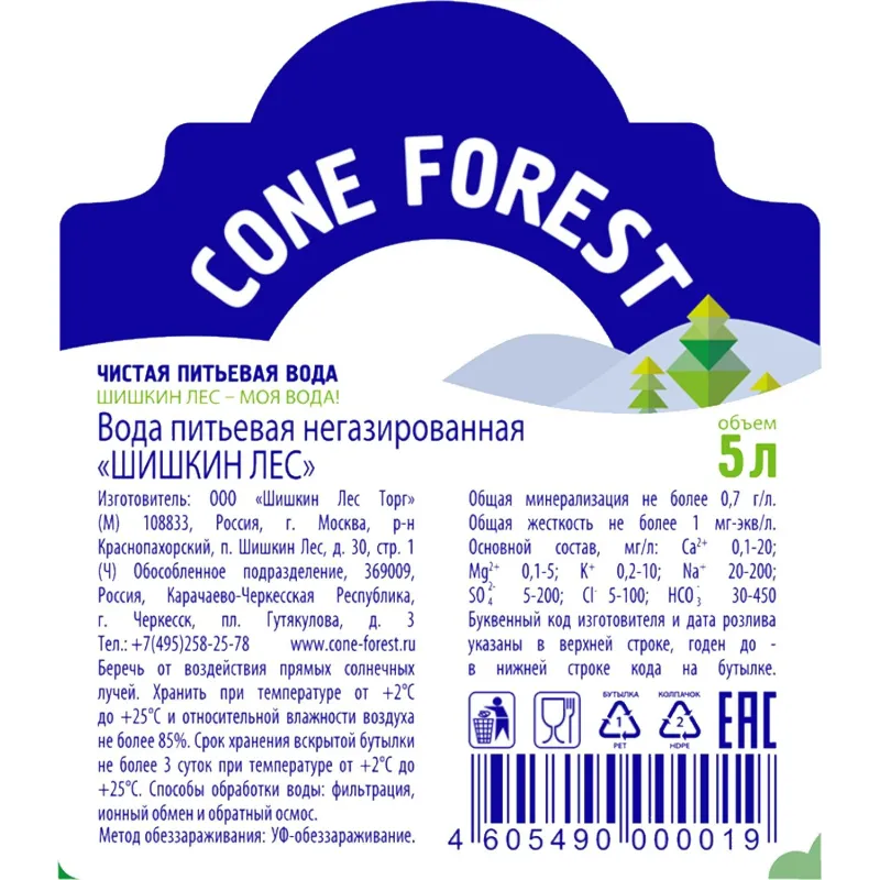 Вода питьевая Шишкин Лес негазированная 5 л — предназначена для ежедневного употребления, что обеспечивает оптимальную суточную норму жидкости для семьи из 3-х человек. Подходит для приготовления блюд, напитков, включая чай и кофе, а также для соблюдения режима питья. Данная вода не предназначена для лечебного применения