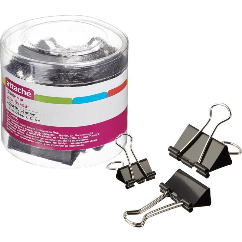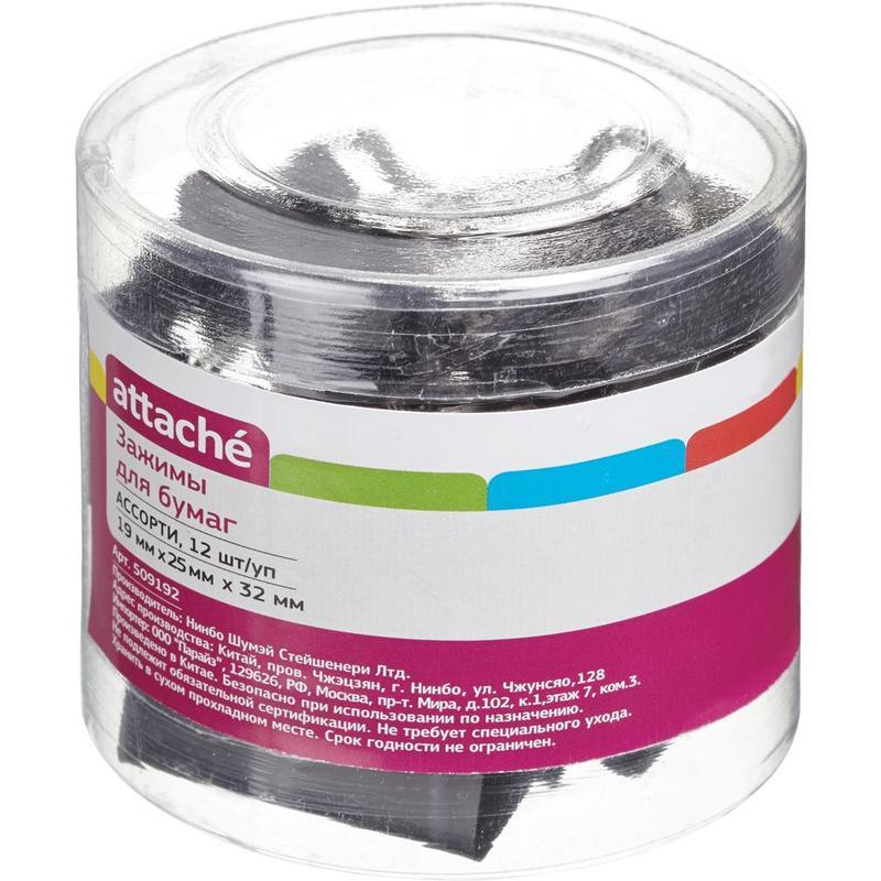 Металлические зажимы для бумаг Attache размером 19, 25 и 32 мм могут скреплять до 80, 100 и 140 листов плотностью 80г/кв.м, не деформируя их. Выполнены в черном цвете. Зажимы длябумаг поставляются в пластиковом боксе.