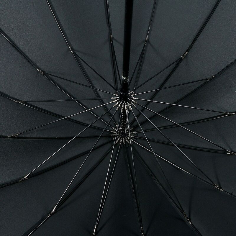 Зонт мужской трость механический. Количество спиц: 16. Длина спиц: 76 см. Диаметр купола: 133 см. Длина зонта: 102 см. Вес: 760 гр. Форма ручки: крюк. Материал ручки: дерево. Материал купола: полиэстер. Материал спиц: фибергласс.