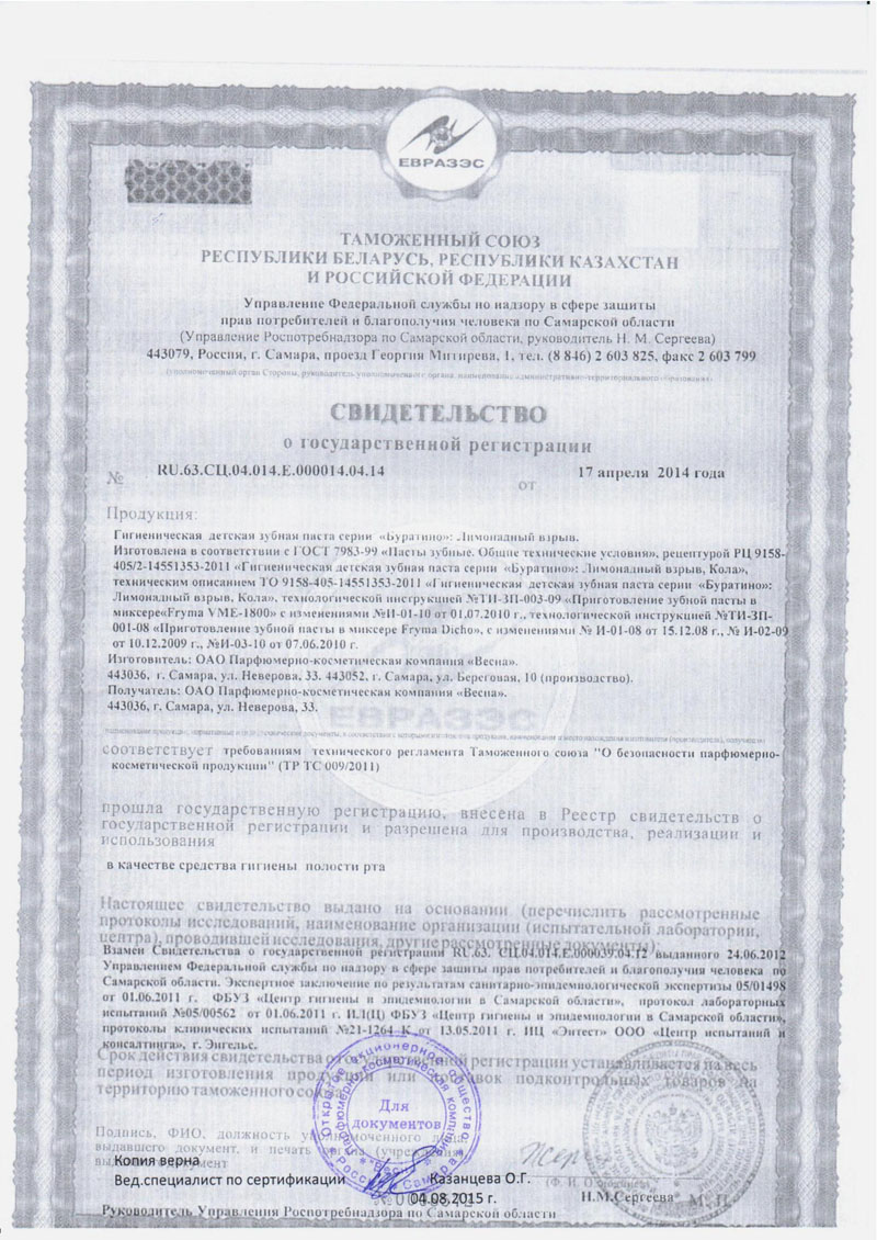 Зубная паста для детей Весна Буратино лимонадный взрыв — безопасная и эффективная детская зубная паста со вкусом любимого многими лимонада, обеспечивает надежную защиту от кариеса. Для детей от 2 лет. Преимущества: — яркий дизайн; — безвредна при проглатывании; — безопасное количество фтора; — нежная формула не травмирует эмаль молочных зубов.